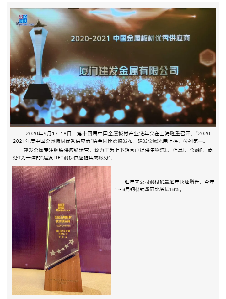 位列第一 | 建發(fā)金屬獲評“2020-2021年度中國金屬板材優(yōu)秀供應商”